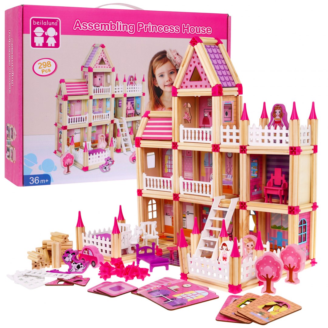 | | Zestaw drewnianych, kolorowych i bezpiecznych klocków dla dzieci od 3-go roku życia. Pakiet składa się z 298 elementów, które po ułożeniu tworzą drewniane domki dla księżniczek. Prócz elementów konstrukcyjnych w zestawie znaleźć możemy również klocki w kształcie drzewa, z postaciami księżniczek, czy autami, jest też obrazkowa instrukcja. |
