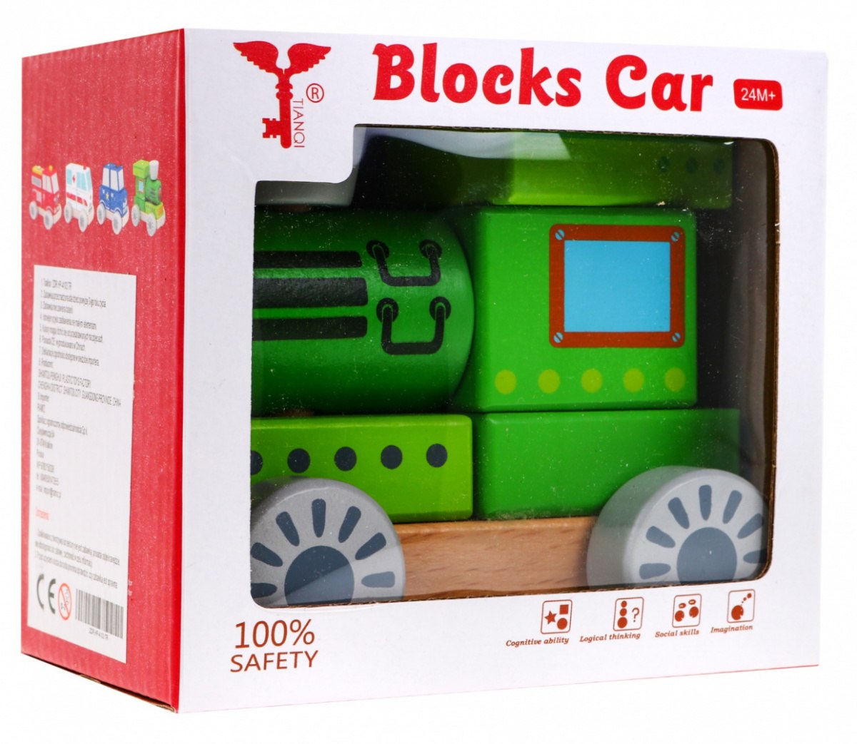| | - 6 klocuszków, - podstawka z drewnianymi kołeczkami, - 4 ruchome kółeczka. |