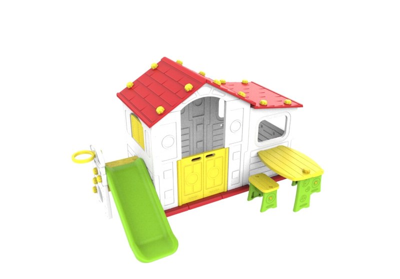 | Specyfikacja | Domek ogrodowy ze zjeżdżalnią, koszykówką oraz ze stolikiem |