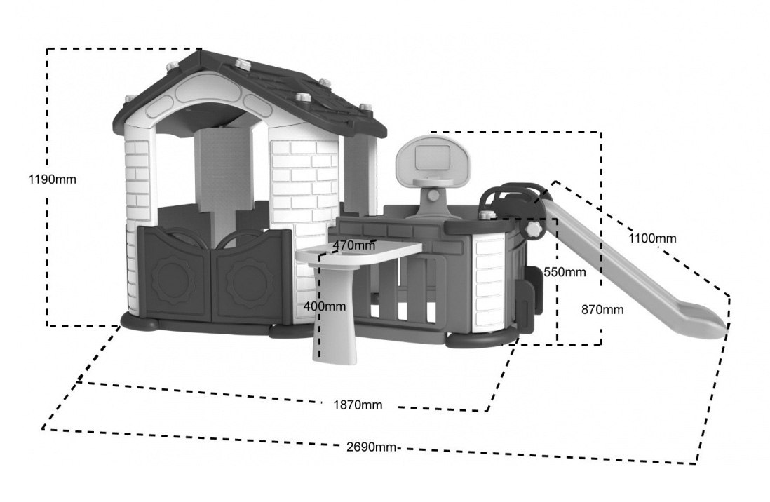 | Specyfikacja | Domek ogrodowy ze zjeżdżalnią, koszykówką oraz ogródkiem ze stolikiem [ZOG.CHD-808] |