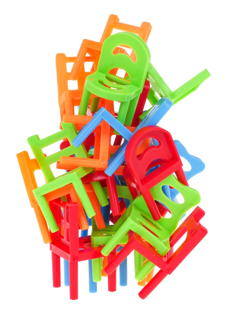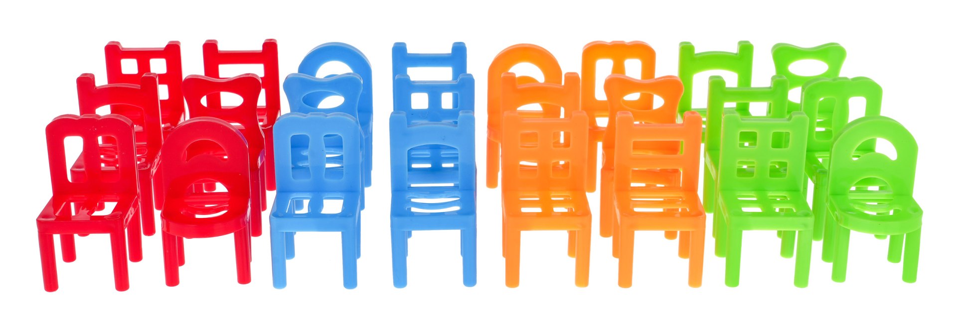 | Popularna gra krzesła, przeznaczona dla dzieci od 4-go roku życia. Niewielki rozmiar opakowania sprawia, że grę można zabrać wszędzie ze sobą. Zestaw składa się z 24 krzesełek w 6 różnych kształtach i 4 kolorach (niebieskim, pomarańczowym, zielonym i czerwonym). Gra polega na układaniu wieży z krzesełek. Gracze ustawiają krzesełka po kolei jedno na drugim. Gracz, który spowoduje, zawalenie się wierzy, przegrywa. Gra uczy cierpliwości, zręczności i uwagi, pozytywnie wpływa na koordynację ręka-oko. | |