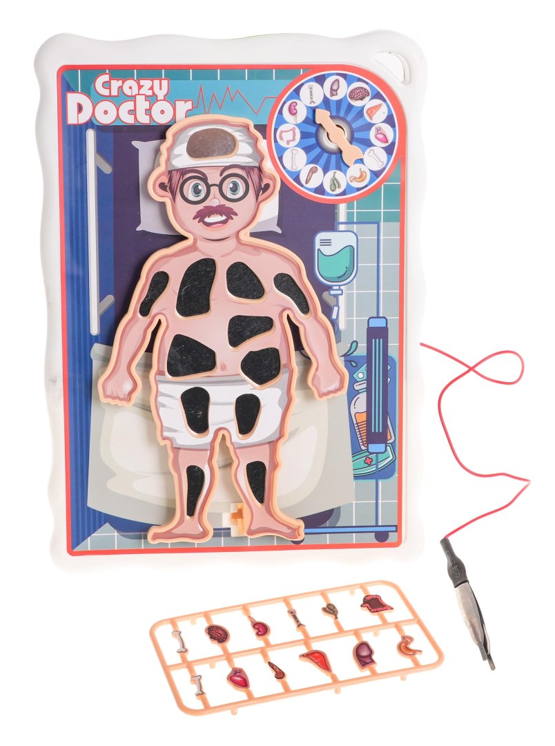 | Gra zręcznościowa Szalony Lekarz ,przeznaczona jest dla dzieci od 4-go roku życia. W tej grze wcielamy się w rolę doktora i przeprowadzamy operację. Nasz pacjent ma 12 różnych miejsc na ciele, należy w nich właściwie ułożyć narządy. Następnie kręcimy kołem i sprawdzamy, co wskazuje strzałka. Wylosowany organ należy delikatnie wyjąć z danej części. Jeżeli nawet lekko dotkniemy powierzchni pacjenta, on zadrży, zacznie brzęczeć i nie uda nam się go uratować. Gra wymaga skupienia i precyzji, uczy koordynacji ręka-oko. Z tyłu planszy znajduje się schowek, w którym umieścić możemy wszystkie akcesoria. Zabawka zasilana jest bateriami typu 3 x AA 1,5V, których brak w zestawie. Zasady gry: - ułóż organy we właściwych miejscach na ciele pacjenta, - zakręć strzałką, - delikatnie precyzyjnie usuń narząd z ciała pacjenta dołączoną do zestawu pęsetką, - jeżeli dotkniesz pacjenta, nie da się go uratować, a ty przegrywasz, - w grę możesz grać samodzielnie lub 2 graczy, przegrywa ten, komu nie uda się uratować pacjenta. | |