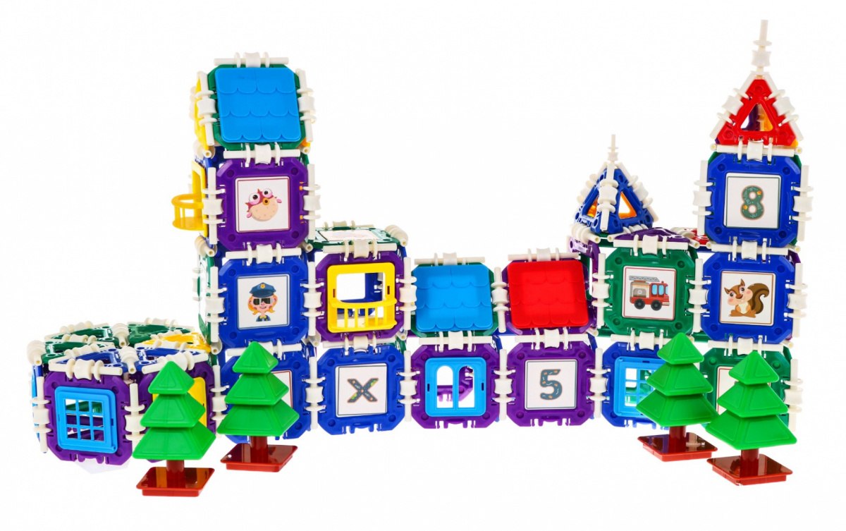 | - klocki 252 elementy: * 54 kwadraty w kolorze zielonym, niebieskim i fioletowym, * 120 elementów łączących, * 36 trójkątów w kolorze zielonym, czerwonym, żółtym, niebieskim i fioletowym, * 4 choinki, * 38 pozostałych elementów konstrukcyjnych, - naklejki na klocki, - obrazkowa instrukcja. |