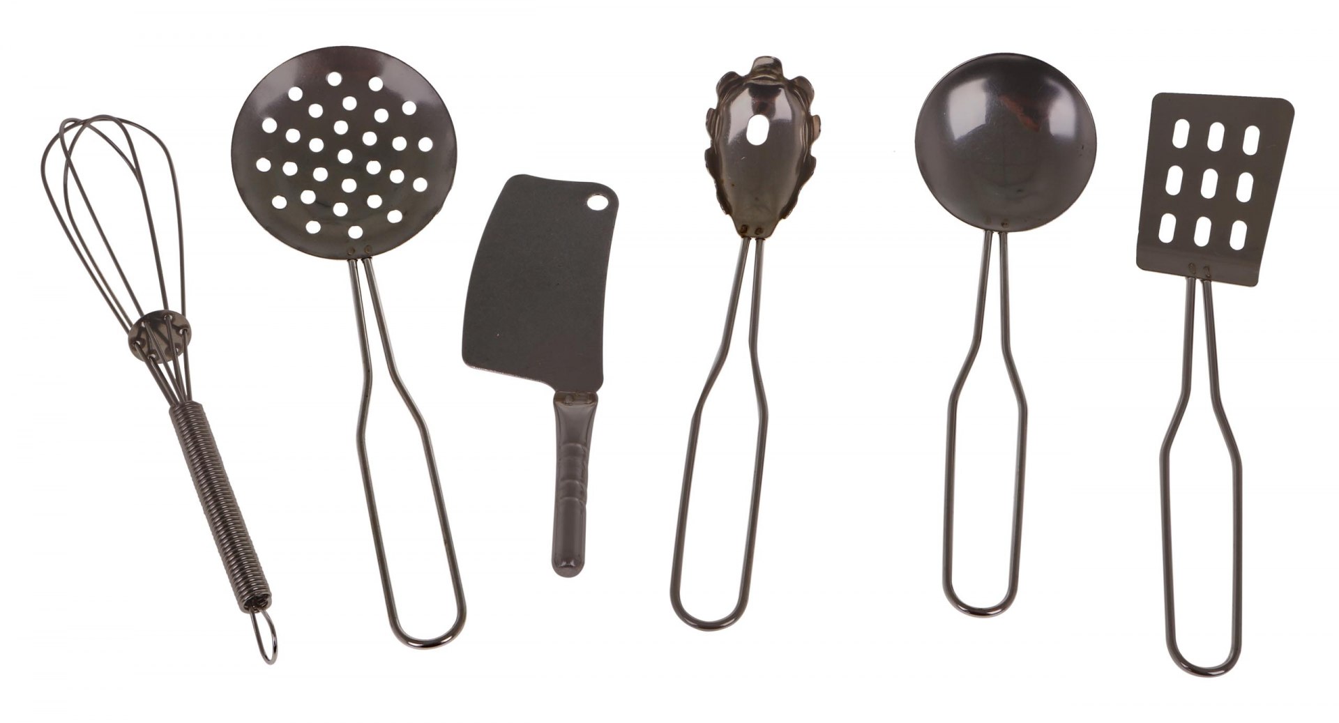| | - metalowy garnek ok. 13x13x4cm, - metalowy garnek ok. 14x14x2.5cm, - metalowy durszlak ok. 14x14x4cm, - metalowa miska ok. 10x10x3cm, - metalowa pokrywka ok. 9.8x9.8.2.5cm, - metalowa podstawka ok. 11x11cm, - metalowy garnek ok. 13x13x7cm, - metalowa patelnia ok. 16.5x10x2.5cm, - metalowa pokrywka ok. 9x9x2.5cm, - metalowa łyżka cedzakowa ok. 14x4.8cm, - metalowa chochla ok. 13.1x4cm, - metalowa łyżka do makaronu ok. 12.8x2.5 cm, - metalowo trzepaczka ok. 14x2.5cm, - metalowa łopatka ok. 14x3cm, - metalowy tasak ok. 7x4.5cm, - metalowa pieprzniczka (z trzema rodzajami otworów) ok.8x4x4cm, - materiałowa podstawka ok. 11.3x11.3cm, - plastikowa papryka ok. 6.5x4.9cm, - plastikowy brokuł ok. 6.2x5.9cm, - plastikowa kukurydza ok. 8.5x5cm, - 2x plastikowa marchewka ok. 6.8x3.5cm, - plastikowa cytryna ok. 7.2x5.2cm, - plastikowy stek ok. 6.8x5.5cm, - plastikowe jajko sadzone ok.6.4x5.8cm, - plastikowy pomidor ok. 6x4.5cm, - plastikowa ryba ok. 8.2x4.2cm, - plastikowy grzyb ok. 4x4.5cm, - plastikowy czosnek ok.4x4cm, - plastikowy kurczak z rożna 7x4.5cm, |