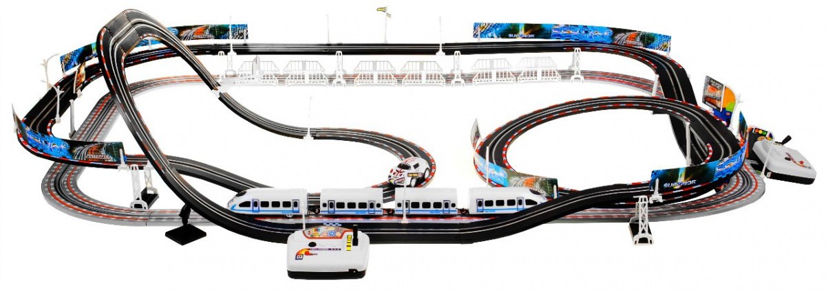 | | Podwójny tor wyścigowy którego konstrukcyjne elementy pozwolą zbudować tor z ostrymi zakrętami, serpentynami i odcinkami prostymi, a wszystko po to, aby maksymalnie uatrakcyjnić zabawę. Zestaw posiada 2 bezkolizyjne skrzyżowania i 2 pętle. Dzięki temu autko i kolejka mogą bezwypadkowo poruszać się po swoich torach. Piloty posiadają ergonomiczny kształt idealnie dopasowany do dłoni dziecka tak, aby nie wyślizgiwały im się z rąk podczas zabawy. Zasilanie zestawu to 4 baterie typu AA (brak w zestawie). |