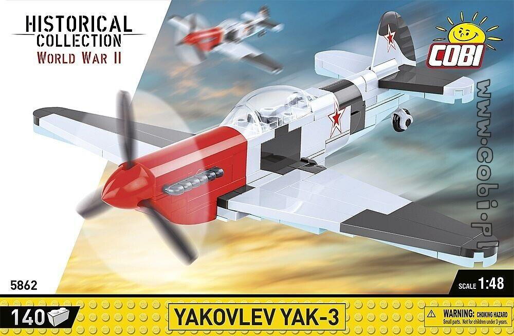 W Kolekcji Historycznej zawitał Jak-3 (ros. -3). Jest to radziecki samolot myśliwski, który był produkowany od 1944 roku. Należy do rodziny samolotów powstałych w biurze konstrukcyjnym Jakowlewa i stanowi rozwinięcie konstrukcji nie mniej znanego samolotu Jak-1. Yak-3 zyskał opinię solidnej i łatwej w utrzymaniu maszyny. Był lubiany zarówno przez pilotów, jak i obsługę naziemną. Co ciekawe był jednym z najmniejszych i najlżejszych myśliwców drugiej wojny światowej. Bardzo dobry stosunek mocy do niskiej masy sprawiał, że samolot uzyskiwał doskonałe osiągi, co czyniło go groźnym przeciwnikiem. Ze 140 klocków konstrukcyjnych COBI wybudujesz historyczny radziecki myśliwiec z okresu drugiej wojny światowej! Klockowy model zawiera wysokiej jakości nadruki oraz odpinane podwozie. Samolot ma 18,5 cm długości oraz 20 cm rozpiętości skrzydeł i idealnie pasuje do naszej rosnącej kolekcji historycznej! YAK-3 to łatwy w budowie model, idealny na dobry początek przygody z klockami konstrukcyjnymi COBI. Jest to samolot, na który szczególną uwagę powinni zwrócić pasjonaci lotnictwa, techniki wojskowej oraz historii. Buduj historię, klocek po klocku razem z COBI! 140 wysokiej jakości elementów, wyprodukowane w UE przez firmę z ponad 20-letnią tradycją, spełniają normy bezpieczeństwa dotyczące produktów dla dzieci, w pełni kompatybilne z innymi markami klocków konstrukcyjnych, klocki z nadrukami nie odkształcają się i nie bledną w czasie zabawy czy pod wpływem temperatury, czytelna i intuicyjna instrukcja oparta na rysunkach i ikonach, 100% nadruków, żadnych naklejek, Wymiary modelu (dł x szer x wys): 18,5 cm (7.3) x 20 cm (7.9") x 9,5 cm (3.7")