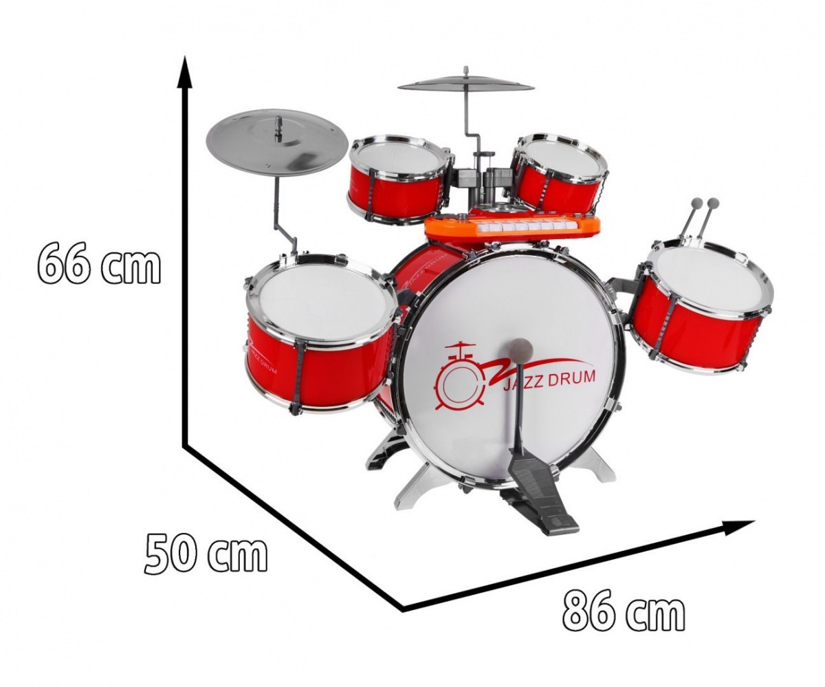 | Wymiary zestawu (perkusja + keyboard): - wysokość ok. 66 cm, - szerokość ok. 86 cm, - głębokość ok. 50 cm. Wymiary mikrofonu na stojaku: - wysokość ok. 108 cm, - szerokość ok.40 cm. Wymiary bębnów: - średnica dużego bębna ok. 37 cm, - średnica średniego bębna ok. 19 cm, - średnica małego bębna ok.15 cm. Wymiary stołeczka: - wysokość ok. 23 cm, - średnica podstawy ok. 23,5 cm, - średnica siedzenia ok. 20 cm. Wymiary opakowania: - wysokość ok. 53 cm, - szerokość ok. 53 cm, - głębokość ok. 24,5 cm. | |