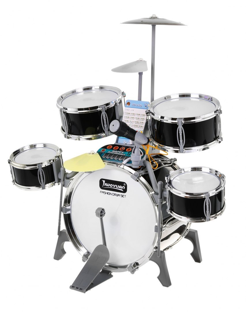 | - bęben duży z pedałem do uderzania, - 2 x średni bęben, - 2 x mały bęben, - talerz metalowy, - 2 x talerz elektroniczny, - mikrofon, - 2 x pałeczka, - stołek, - kabel audio, - 6 kart z nutami, - obrazkowa instrukcja. | |